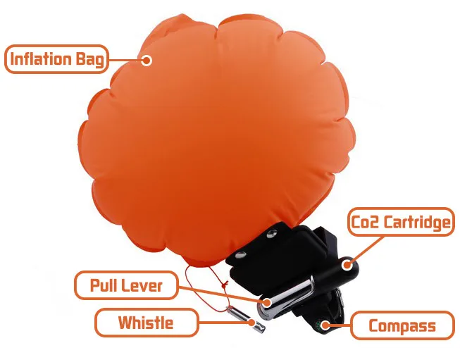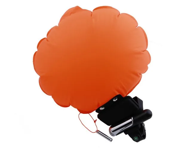 The user lifts the handle to release an inflatable co2 cartridge which then immediately inflates the bag.