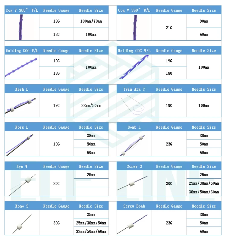 Tornado screw | With 2 strands of screw shaped sutures can hold skin more tightly and stimulate collagen twice more than normal screw type. |