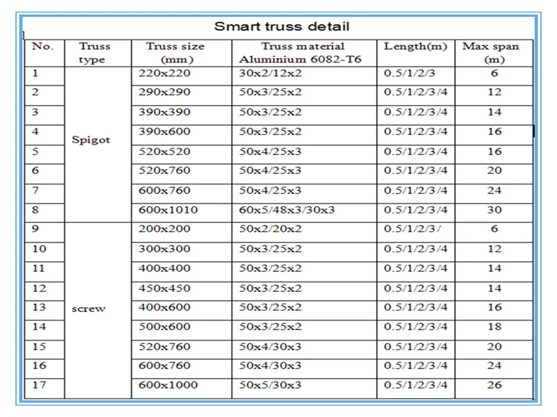 Truss type: | Ladder, triangle, square truss, triangular truss, circular truss, arch truss, etc |