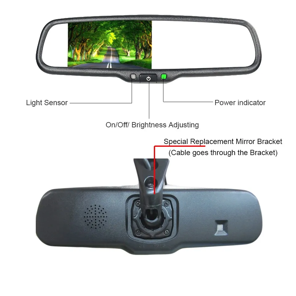 10.2 ways Av input 11. Replace the original car mirror(provide different car mirror base) 12. Monitor brightness adjusts automatically according to background brightness.