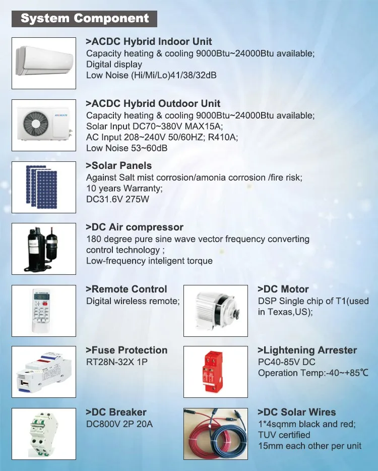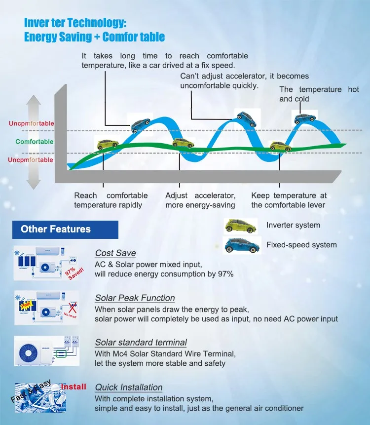 1.\tAC/DC dual power supply:Air Conditioner works directly with 2 powers ( solar panel power + electricity power). The change between 2 powers happened automatic and seamless depend in solar strength.