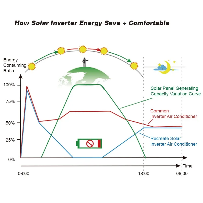 While Inverter Air Conditioners are more powerful and use less energy than a fixed speed air conditioner, Recreate new Solar Hybrid Inverter takes this to a new level of efficiency. The world's first true Solar DC inverter air conditioner allows you to convert the suns energy through Photovoltaic panels into DC power that is feed directly into the DC Compressor. Air conditioner combined between both 2 powered ( AC power , DC power ) both 2 power can work seamless and change between both powers happened automatic depend in sunshine. Air conditioner use solar panel direct power as priority power while grid will be used as a backup only, This technology can let you and your family us air conditioner with free power ( sun power ).