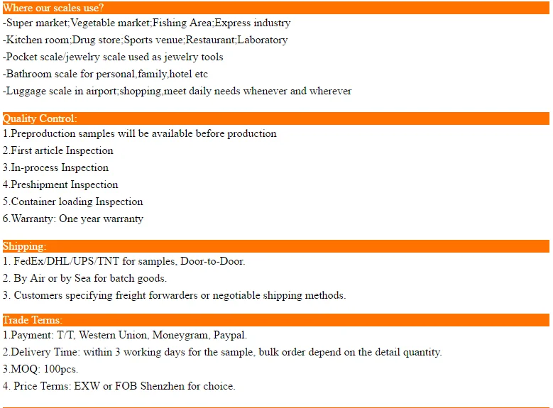 | Specification LCD size:37*14mm Platform size:55mm*50mm Scale: 120*63*20mm Weight:95g Color box: 127*67*22 mm Weight:110g |