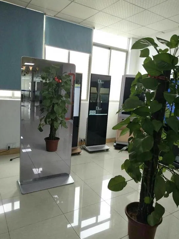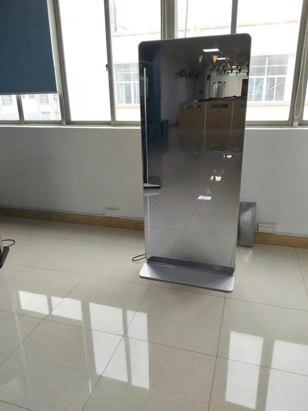 When machine off, it is very clear mirror for client, when start working, can show advertisement, can showing company information, show interactive program, guide and so on.