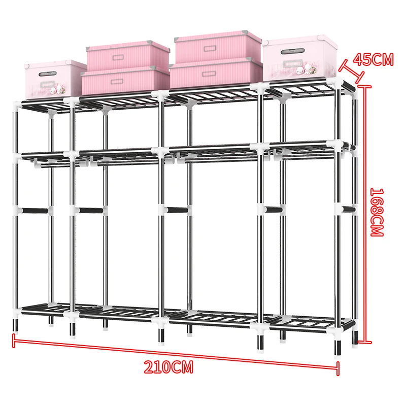 The frame is made of 25mm galvanized steel pipe with original PP material Adapter. The top, bottom and middle layers are all made of steel pipe. Therefore, our cloth wardrobe has a high load-bearing capacity. On the top, you can put suitcases, storage boxes and other idle items. In the middle compartment, you can place more clothes