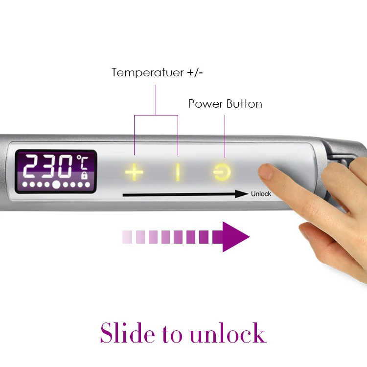 The heat touch buttons "+"/"-" makes it easy to select the perfect temperature every time from 150°C(300℉) up to 230°C(450℉.). And control different heat settings that can be suitable for every type of hair.