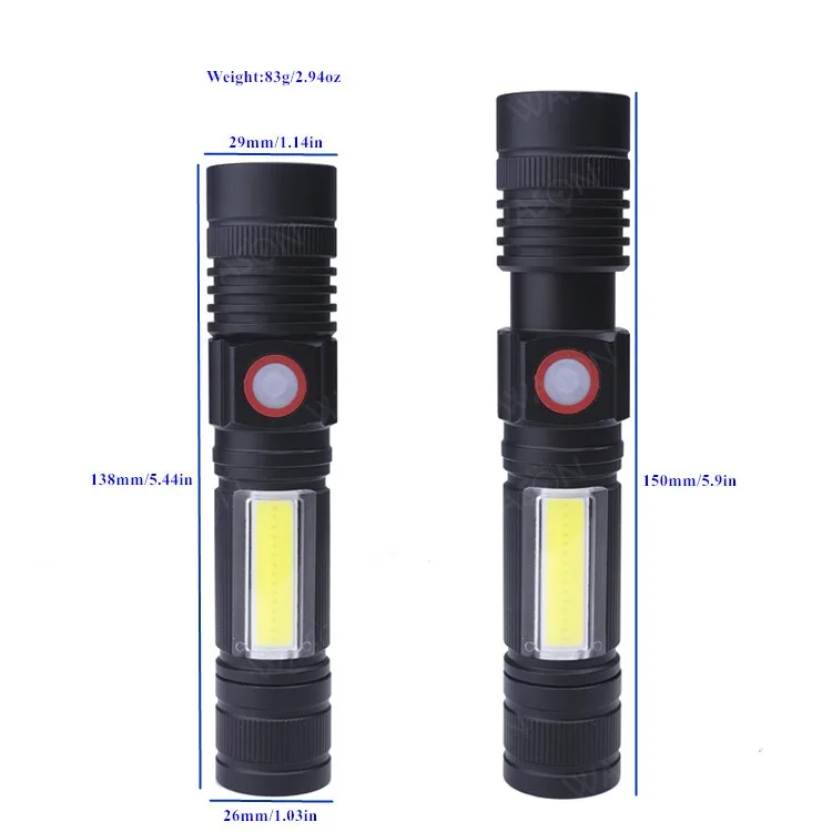 Brightness: | High:350lm Mid:200lm Side COB:200lm | Product's Size: | Zoom In: 138*29*26mm 5.44*1.14*1.03 in Zoom Out: 150*29*26mm 5.9*1.14*1.03 in | |||