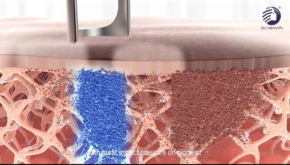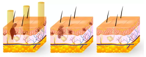 Laser tattoo equipment adopts the Q switch mode, which makes use of the instantaneous emitted laser to break the pigment in ill structure. That's the laser instantaneous emit theory: centralized high energy emit suddenly, which makes laser of settled wave band instantaneously penetrate through cuticle to the ill structure in 6ns, and break the relevant pigments quickly. After absorb the heat, the pigments swell and break down, some pigments (in skin-deep cuticle) fly off the body immediately, and other pigments (deep structure) break down then become the tiny granule can be licked up by the cell, digested and egest from the lymph sell. Then the pigments in ill structure lighten to disappear. Moreover, the laser do not damage the around normal skin.