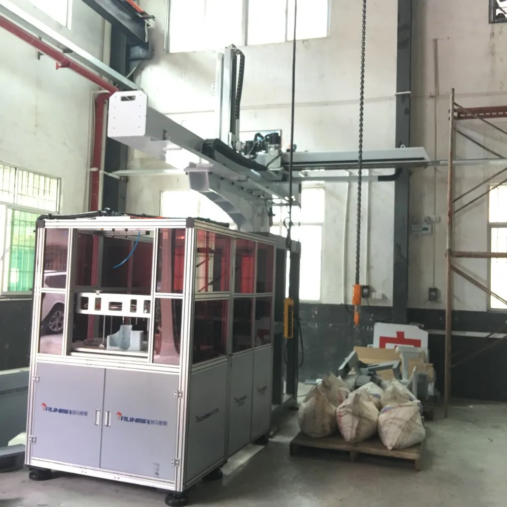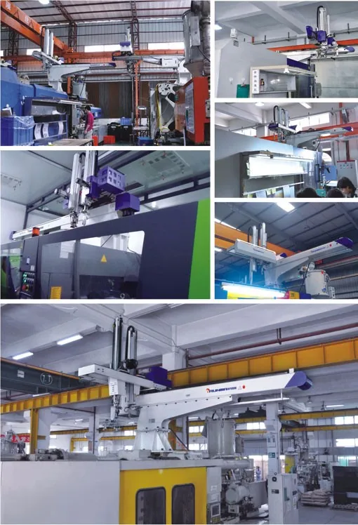 Medium full-servo cross-traveling robot series is mainly applied to take-out of finished products from 50-280T Horizontal injection molding machine, it uses single-cut arm, three-axes of X, Y, Z has AC servo motor driven mode, it is equipped with Japan THK low noise sliding track, quiet and smooth, and has standard configuration.