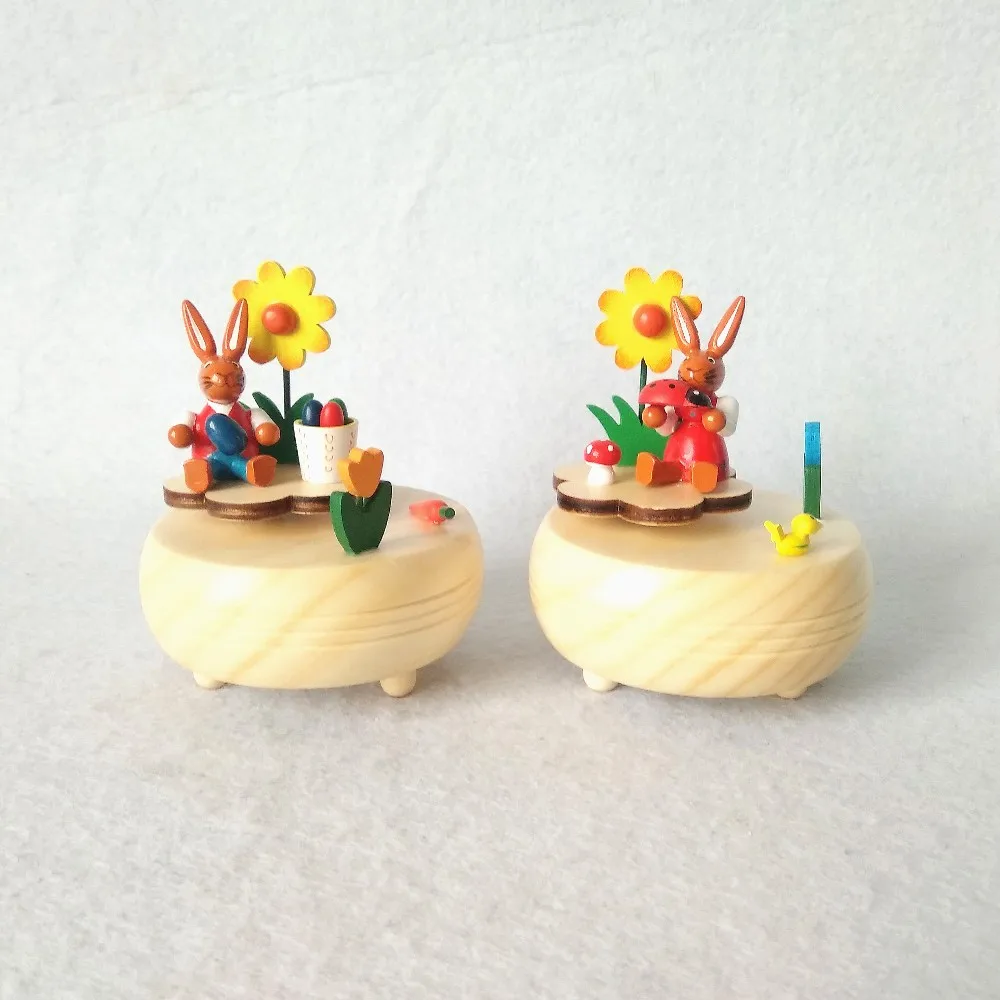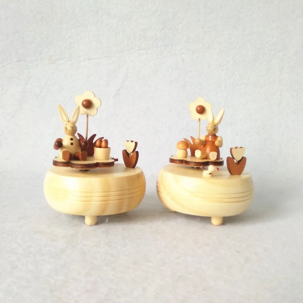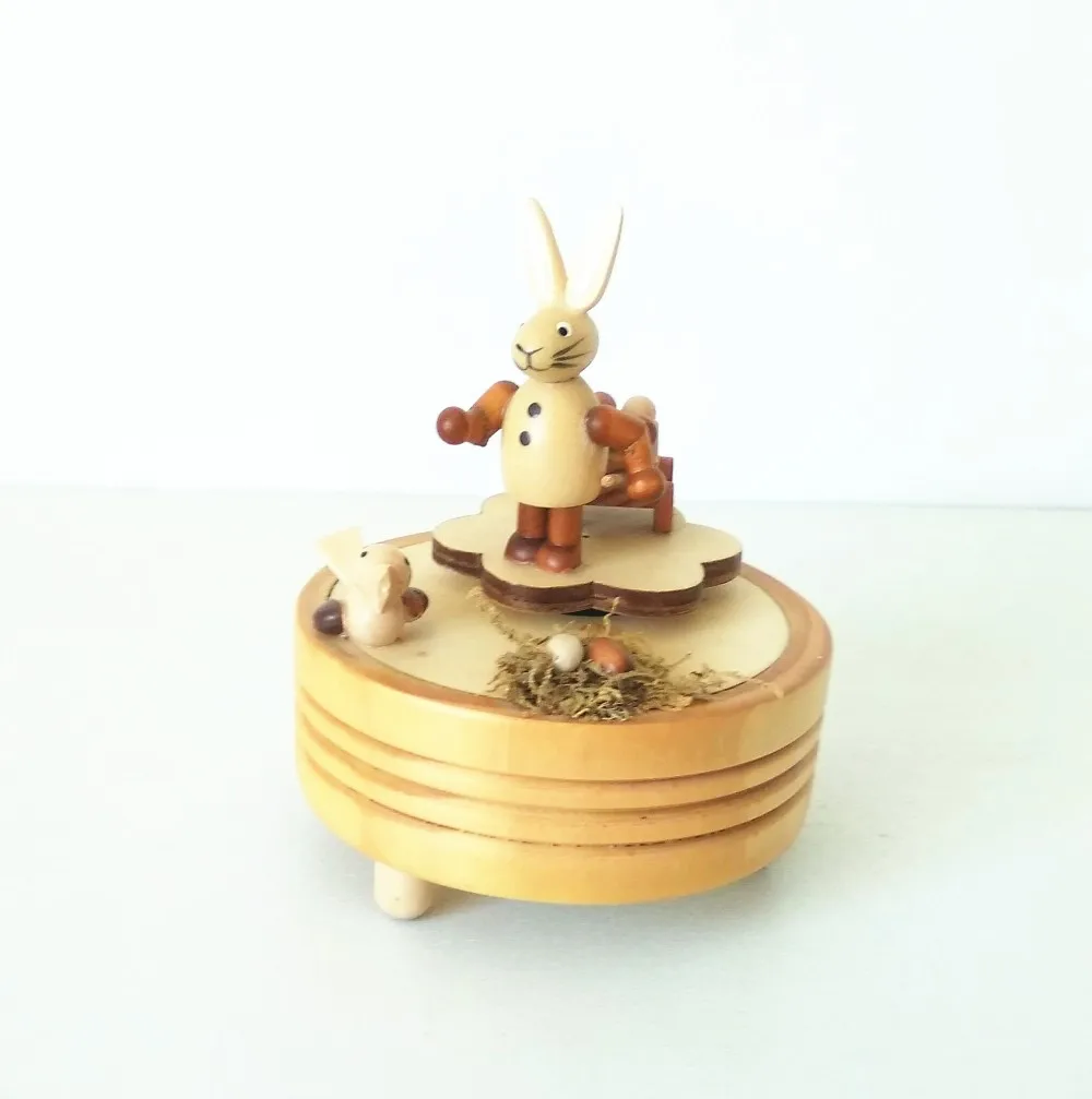 Mini wood round Easter rabbit music box decoration