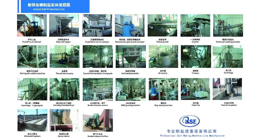 The crude salt is transported to the screw salt washing machine for the first washing, then crushed by roller crusher to get the salt with suitable size. This kind of salt will be washed by stirring washing machine and countercurrent washing machine for two or three times, and then get purified salt. The next step is to enter the centrifuge to remove most of the water. After this the salt will be dried by vibrating fluid drying bed for the drying to get the finished salt with 0.4% water content. During the salt transportation from centrifuge to vibrating fluid drying bed, there will be an iodized machine to add iodine into the salt. The final step is to packing the finished salt.