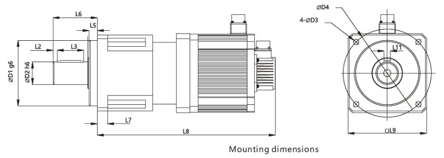 | Rated Power kw | Rated Current A | Reduction Ratio N:1 | Output Torque Nm | Output Speed rpm | D1 Register Diameter mm | L5 Register Length mm | D2 Shaft Diameter mm | L6 Shaft Length mm | L3 Key Length mm | L9 Flange Square mm | D3 Fixing Hole Dia. mm | D4 Fixing Hole Dis. mm | L8 Length mm | |