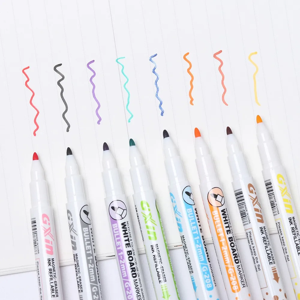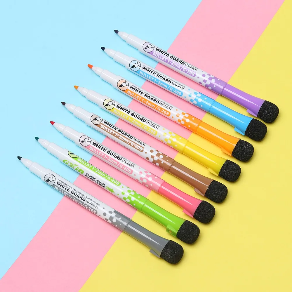 With the rapid and stable development, our company has successively passed ISO9001 Quality Management Certification, ISO14001 Environment Management Certification, OHSAS Occupational Health and Safety Management Certification. Our products meet EN71 and ROHS environmental standards. Factory Directly 8 colors Magnetic Whiteboard Pen Erasable Dry White Board Markers Eraser for Office School Supplies