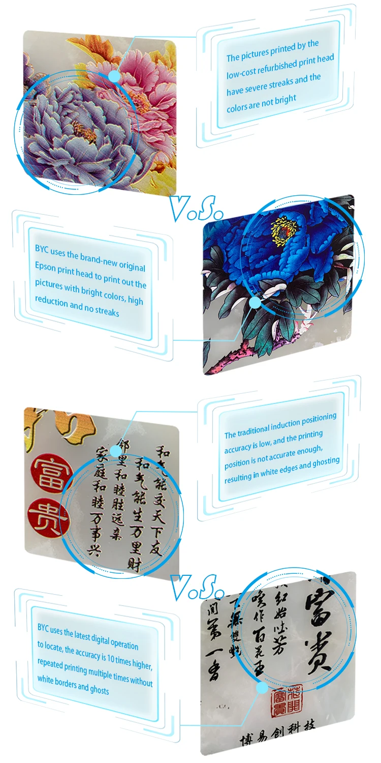 BYC168-6D is the key product from 2018 until now, which integrated the previous advantages of the UV printer we produced and improves the structures of the moving carriage, which helps the printing faster and the printing outcome more clear.