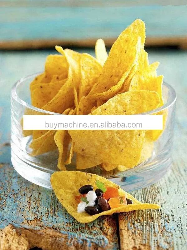 Doritos/Tortilla/Corn chips are kinds of snacks made from corn powder, which are cut and then baked. The main raw materials are corn powder, vegetable oil, salt and water. Although usually made of yellow corn(as pictured), they also can be made of white or red corn. After frying and flavoring, we get very crunchy triangle or other shapes chips, which are popular with both children and adult.