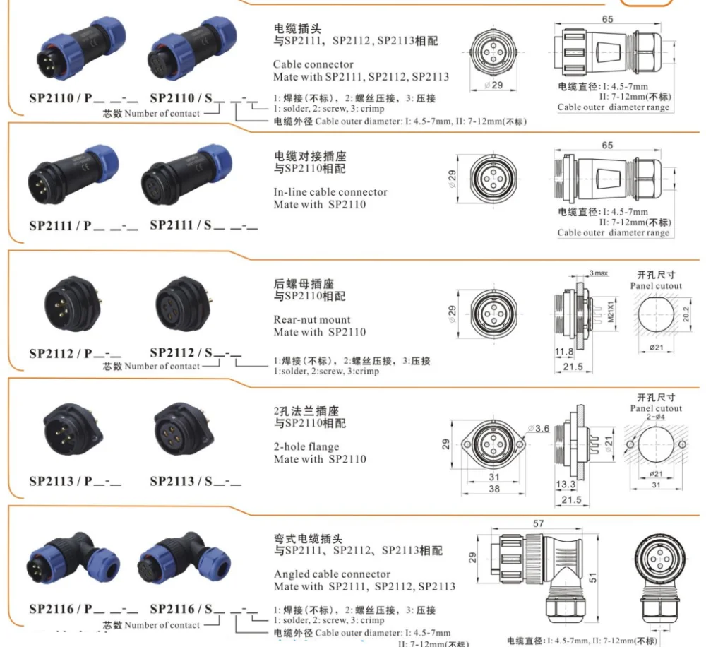 Weipu IP68 SP21 series threaded female SP2111 plastic 2 3 4 5 7 9 12 pins in line ip68 weipu sp21 cable connector