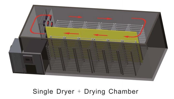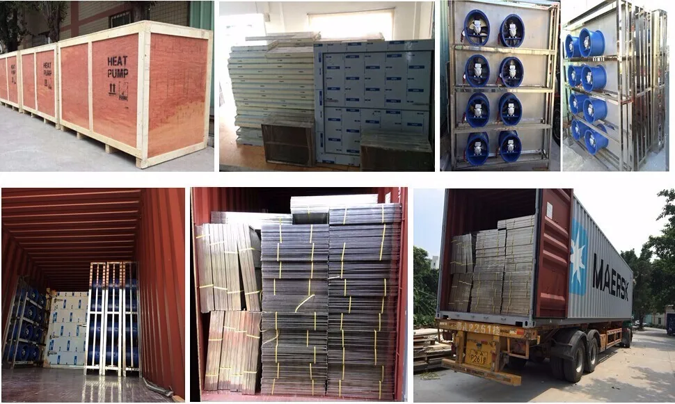 Using the inverse Carnot principle, the gas Freon is compressed by the compressor to become high temperature and high pressure gas (temperature up to 100 C). It enters the heat exchanger (condenser) on the indoor side, and the condensate liquefaction releases high temperature heat to heat the air in the drying room.