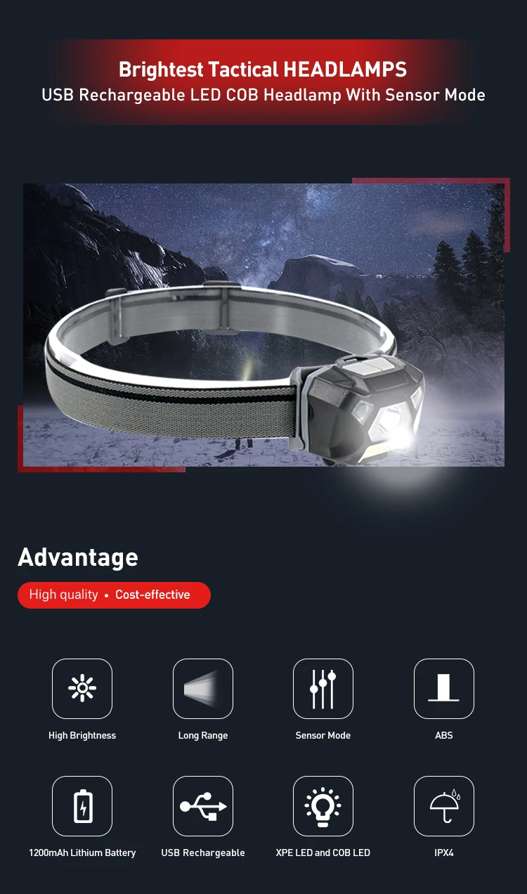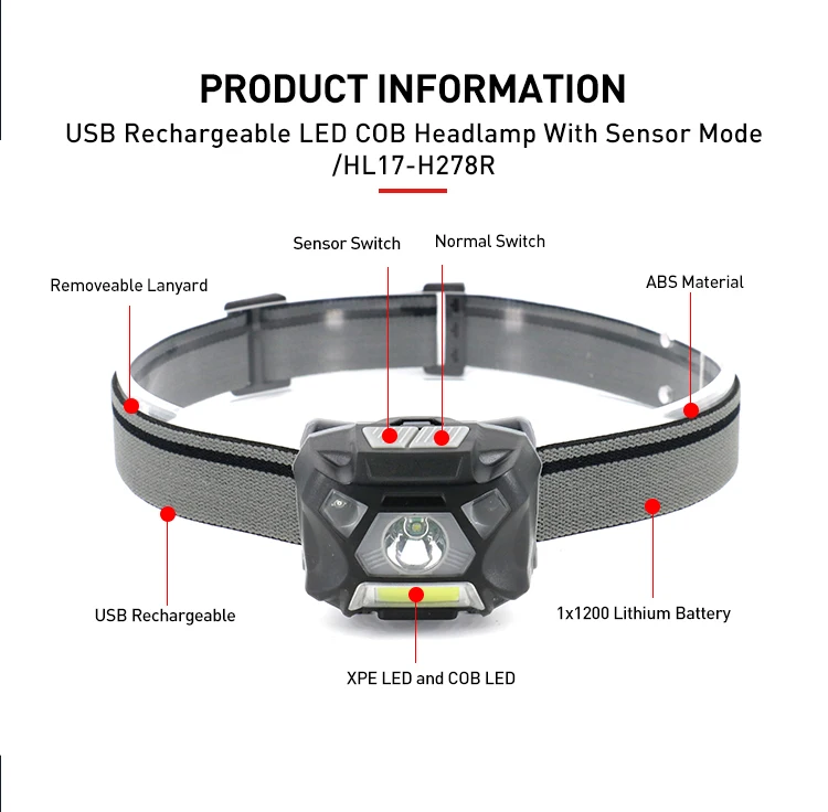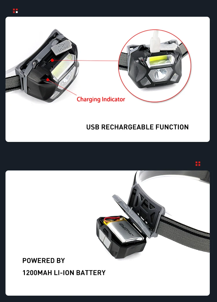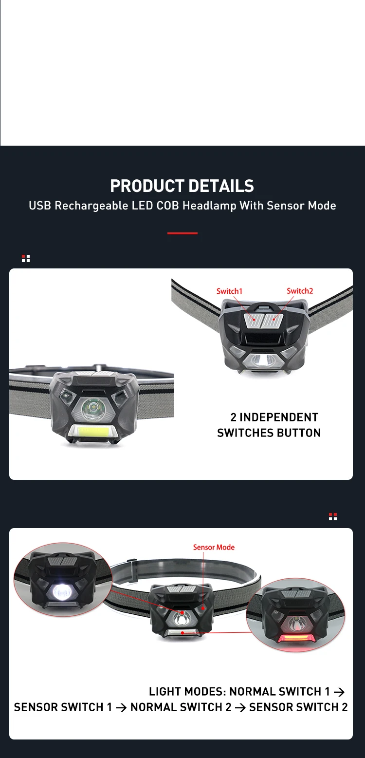 Product Name: | Sensor Function Double Switches COB Head Light USB Rechargeable Waterproof Headlamp LED Camping Head Lamp |