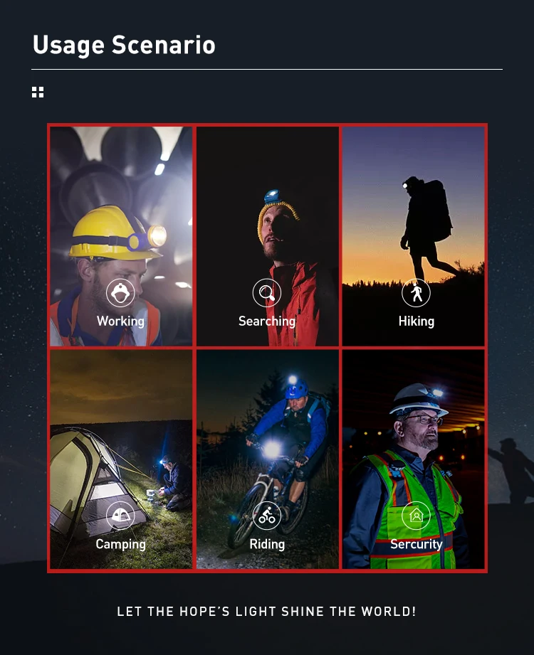 Work Modes: | Normal Switch 1: full light→half light→SOS→blink Sensor Switch 1: Within 10cm,wave your hand in front of the head light to turn the light on/off Normal Switch 2: red light→red light flash Sensor Switch 2: Within 10cm,wave your hand in front of the head light to turn the red light on/off Press button again to turn off the light if nooperation exceed 3s |