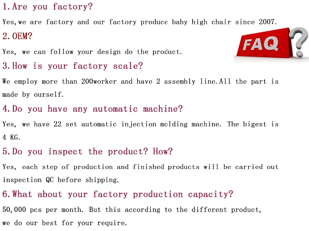 1.Profession: NingBo BeiBeiLe have been offering baby high chair and baby bath set for many years. We aim to be your one-stop supplier for baby chair.Our factory is in NO.62.Industry Road ,Industry District ZhangQi,Cixi City,Zhengjiang Province,315313 China