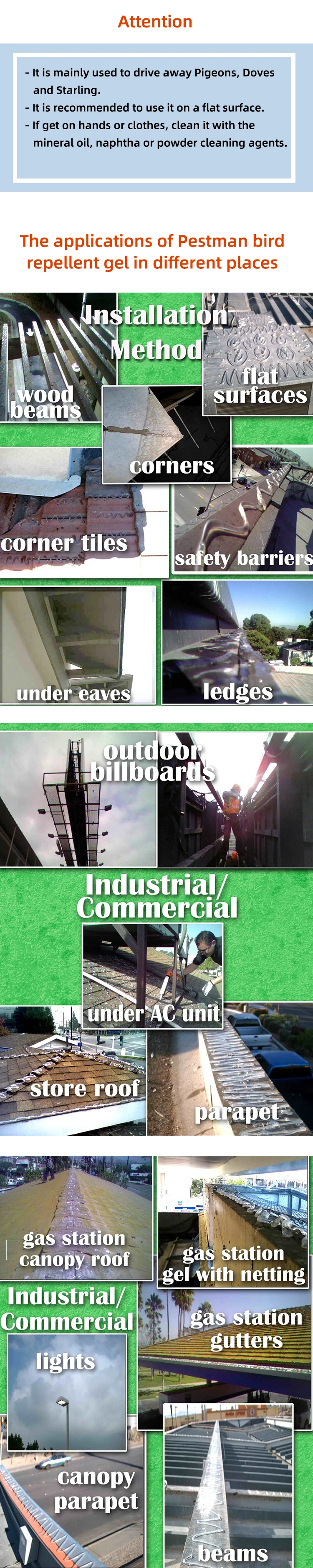 Pestman bird repellent gel was made from some biological repellent active ingredients, and it is Long-acting biological bird repellent. The principle of this product is to use the synergistic effect of bird's vision, touch, smell and taste to achieve the purpose of repelling birds. It is only drive away the birds, and do no harm on them.