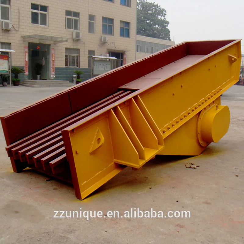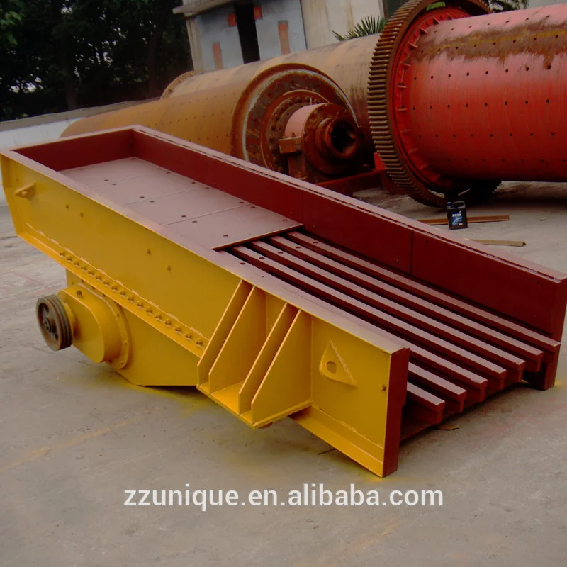 Vibrating feeder, stone feeder, consists of vibrating frame, spring, vibrator, motor vibrating device and motor. The vibrator is made of two fixed eccentric shafts whose gears are jogged. When installation, the two gears must be jogged according to the sign. Through drive of the motor, the two eccentric shafts start rotating to produce a linear huge power which forces the feeder to vibrate. Through the vibration, The materials will slip and sling on the funnel, moving forward, when the materials pass the screening part, smaller parts will fall down, avoiding the further crushing, so screening purpose can be reached.
