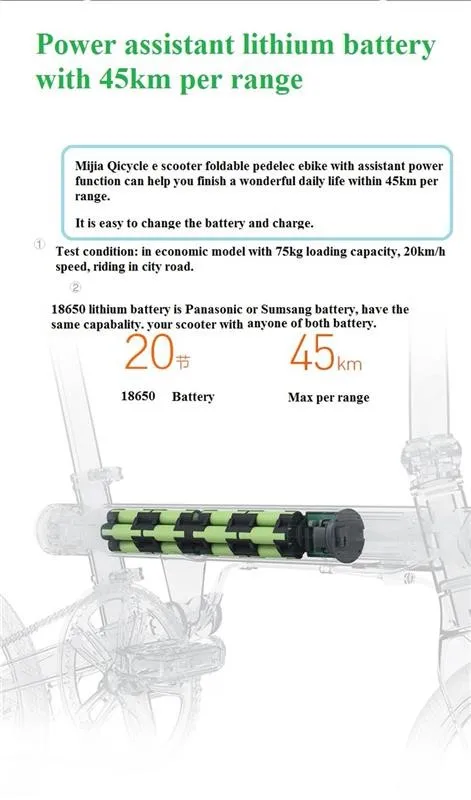- This bike is powered by 18650 lithium-ion battery pack with the total capacity of 208.8Wh, which means the cycling distance can be up to 45km at the condition of 100pct electric power.