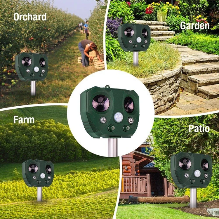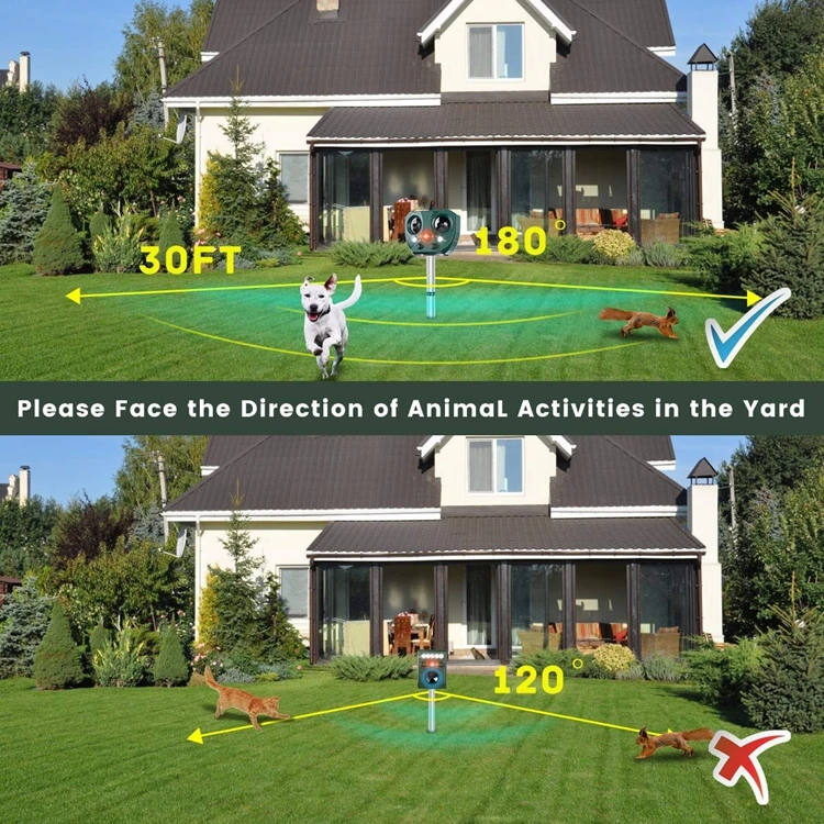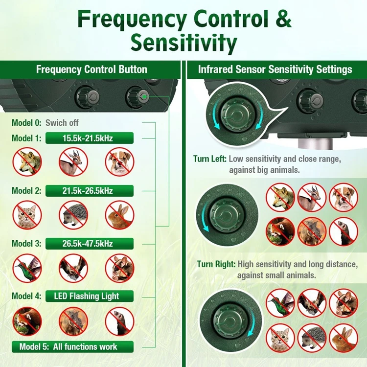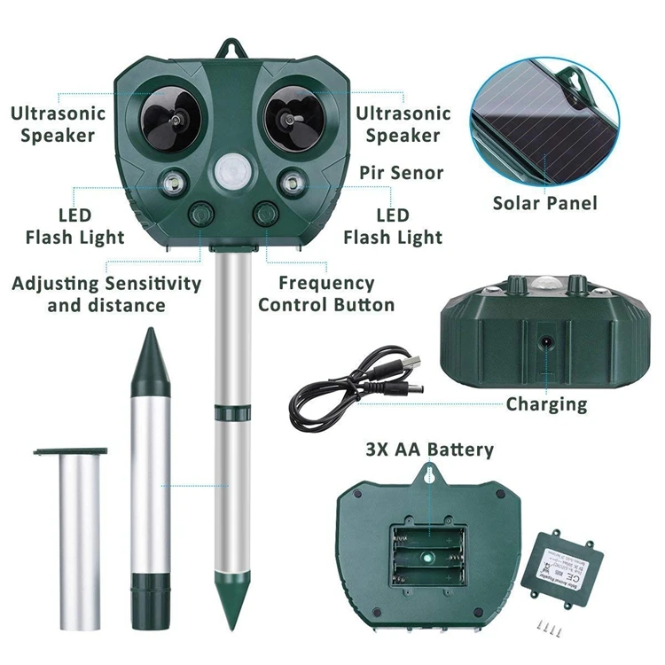 5)eco-friendly &Versatile: No traps, no dead animals, and chemical free. Adjustablefrequency and optional LED flashing and audible alarm allow you to get rid of anyanimals, or repel them at the same time