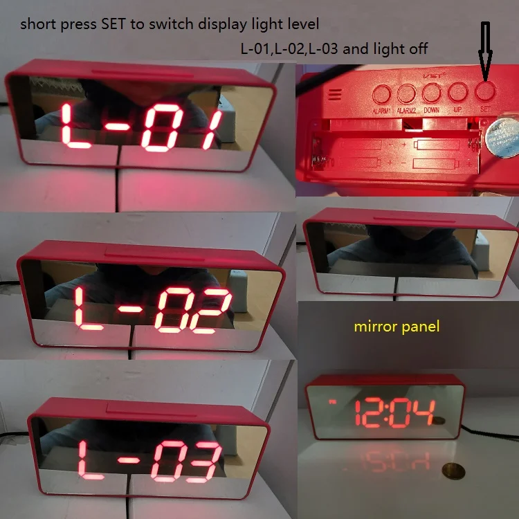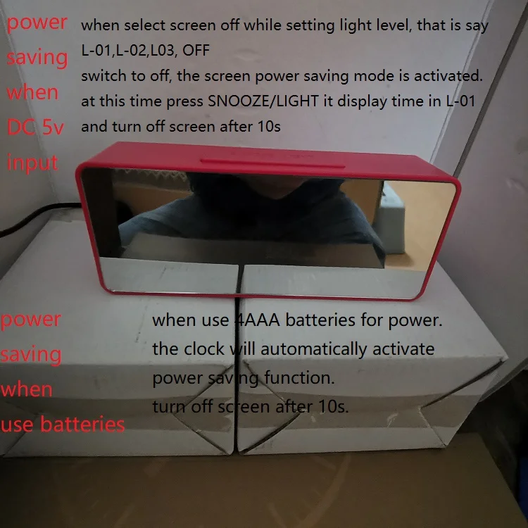 switch to screen off when setting light level, power saving mode activated, press SNOOZE to let screen display in L-01 level,and 10s later again turn off automatically. | |