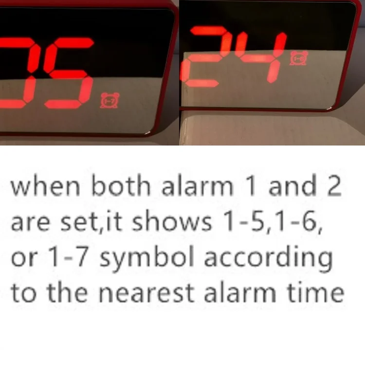 alarm multiple alarm functions | 2 groups of alarm time with 5 mins snooze, workday alarm mode(5,6,7 days a week) switchable 15 pcs natural sound & musics alarm sound |