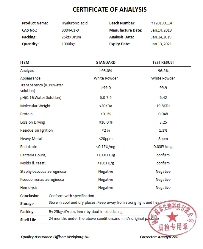 1. Hyaluronic Acid is a high molecular weight polysaccharide with glucuronic acid and N-acetyl-glucosamine as repeating structure unit. HA has strong water retention. Theoretically its binding water capacity is up to 500 ml/g as an ideal natural moisturizing factor.