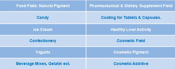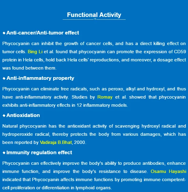 Phycocyanin is one of the rare pigment proteins in nature, not only has vivid color, but also is a nutrient-rich protein, which has a complete amino acids composition and a high content of essential amino acids. Phycocyanin has the physiological activities of anti-cancer, anti-inflammatory, anti-oxidant, improving immunity and scavenging free radicals. In the early 21st century, phycocyanin was widely used as food and cosmetics senior natural pigment, and made into biochemical drugs in United States, Japan and other countries. Because of the strong fluorescence characteristics, Phycocyanin also can be prepared as a fluorescent probe for the photodynamic researches of biology and cytology.