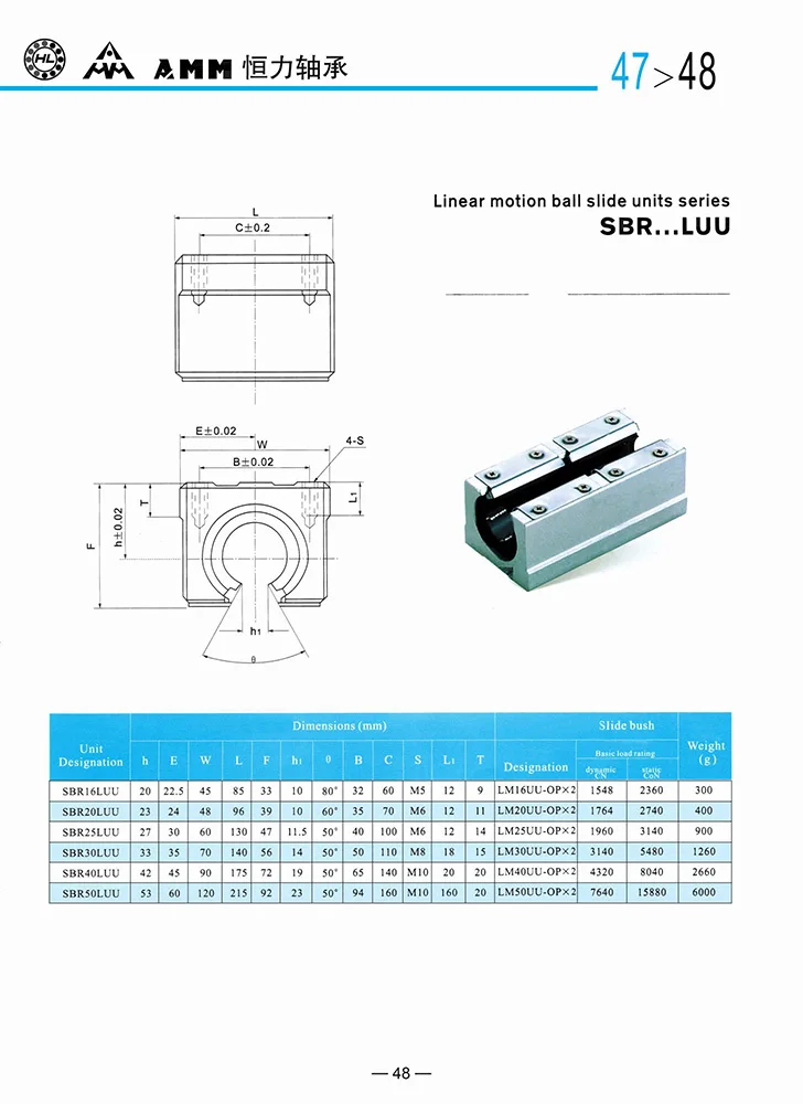 SBR series : SBR 10UU, SBR 12UU, SBR 13UU, SBR 16UU /16LUU, SBR 20UU /20LUU, SBR 25UU /25LUU, SBR 30UU /30LUU, SBR 35UU, SBR 40UU /40LUU, SBR 50UU /50LUU.