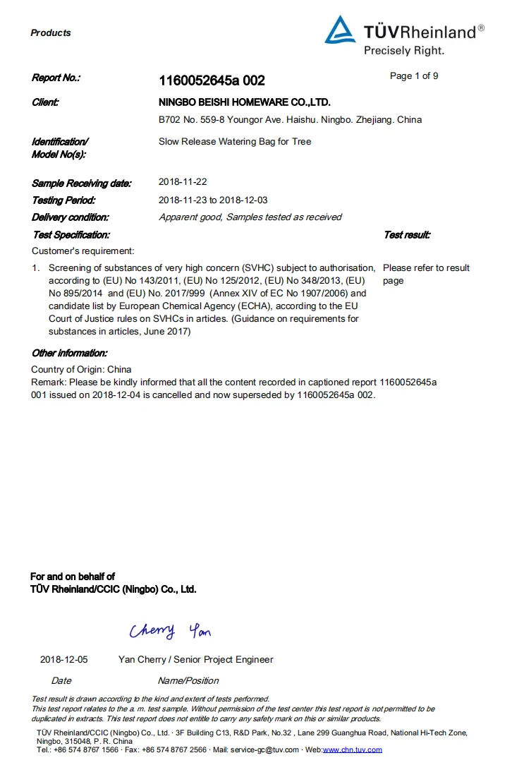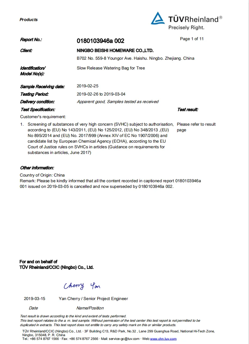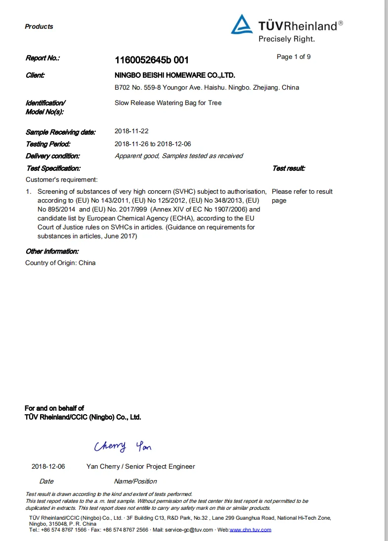Ningbo ZL Electrical Equipment Co., Ltd. is family owned factory mainly for production line of slow release watering bags for trees and evergreens. Ningbo Beishi Homeware Co.,ltd is the company focus on sales to all over the word. Our head office located in Ningbo, a beautiful city in east of China mainland. We enjoy convenient water, land and air transportation.You can reach our head office conveniently in 10 minuites from airtport or in 15 minutes from railway station.