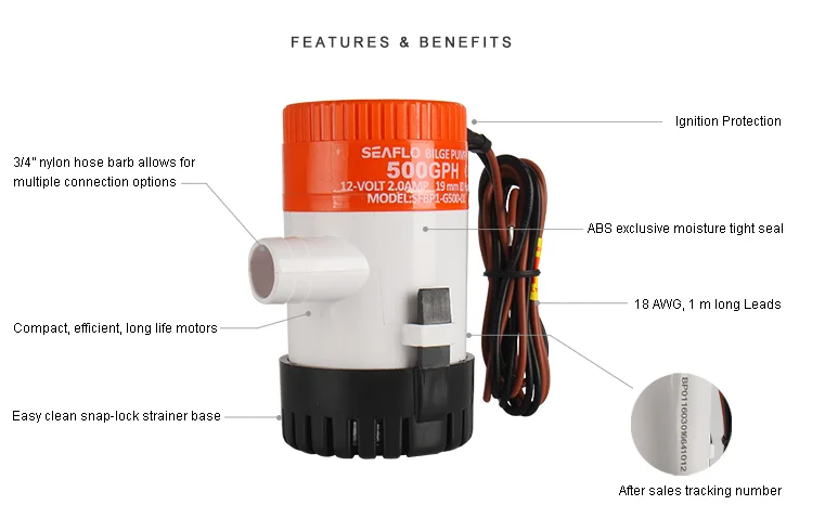 | SFBP1-G500-01 | 618 GPH | 12 V | 4.0 A | 3.0 A | 6.6' (2 m) | 3' (1 m) | 3/4" | 0.33/0.40 kg |