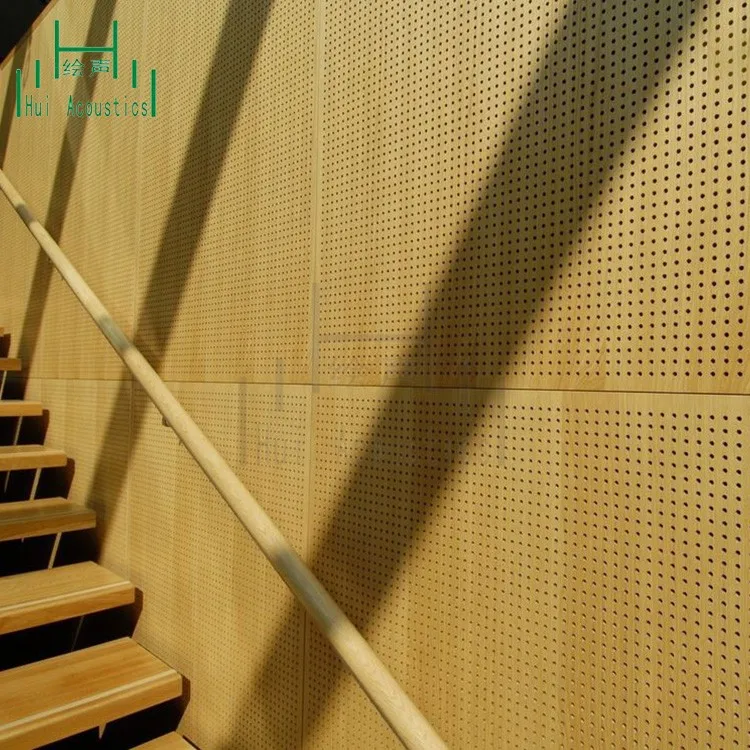 Hui Acoustics perforated wood acoustic panel is a kind of resonance absorption material with holes through on the quality MDF or MgO board. It has strong selection on the sound spectrum and particular great performance on the middle and low frequency. It also has strong impact resistance, excellent decorate performance, elegant color, especially working for wooden construction.