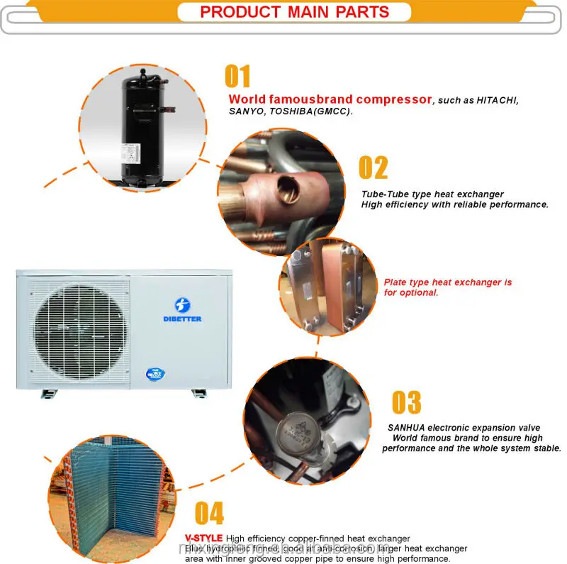 4. World famous brand compressor, four way valve,motor,PCB,corrosion resistant heat Exchanger Emerson controllers