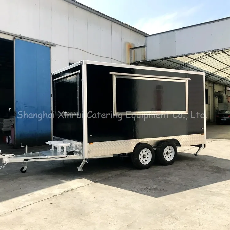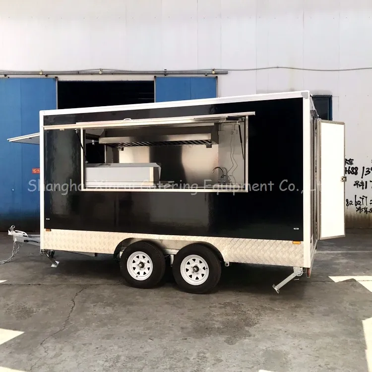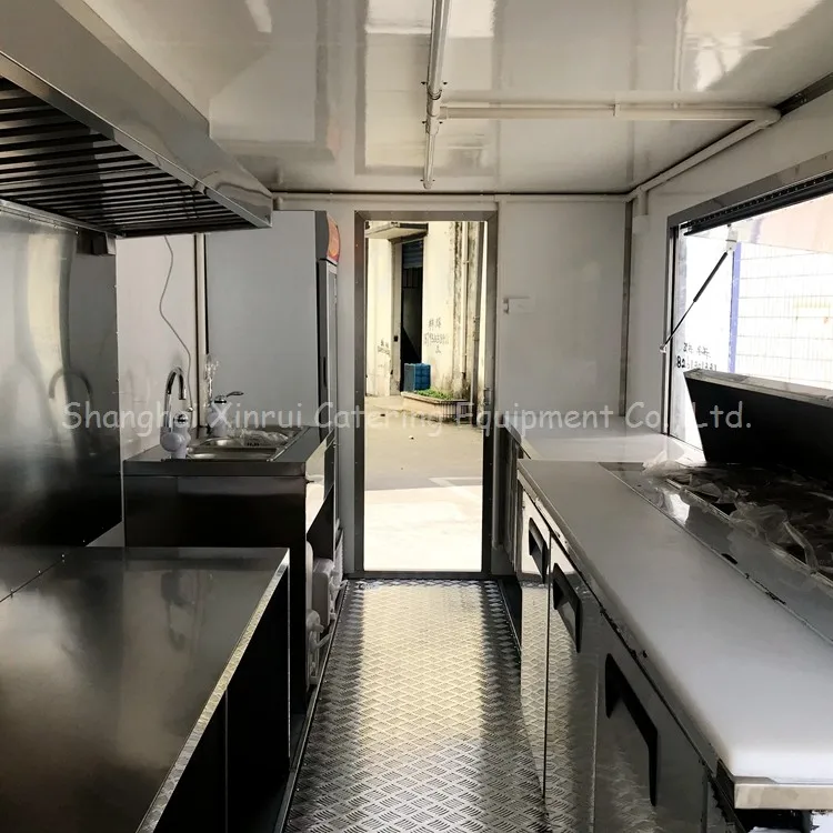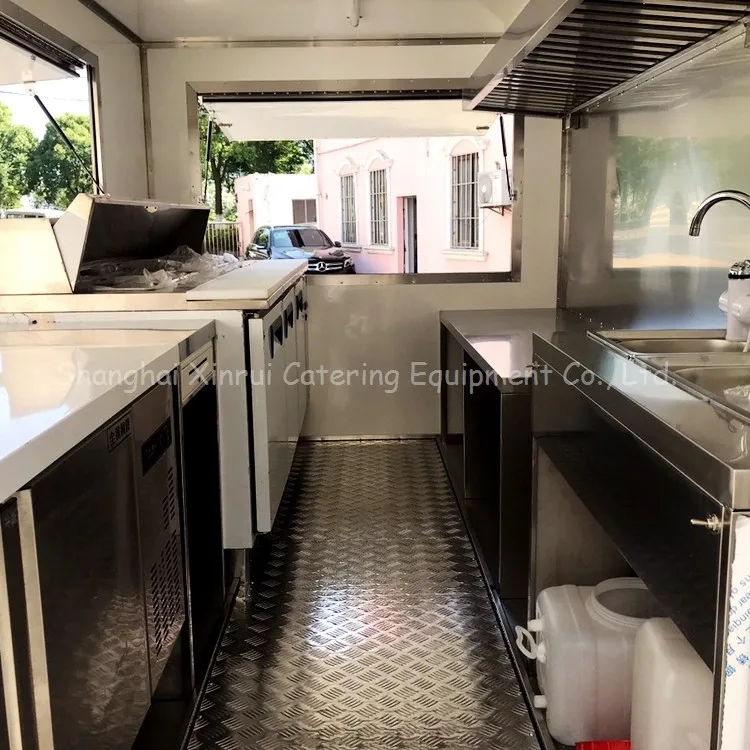 Whole Fiberglass Reinforced Panel (FRP) 45mm construction with strengthening rib at major parts Three big selling windows in one side and front One door in the back 304 stainless steel working benches & related shelves One business cash drawer High visibility tail light signal system | |