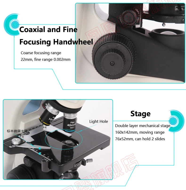 Stage | Double layer mechanical stage,size 160*142mm,moving range 76*52mm,can hold 2 slides | √ | √ |