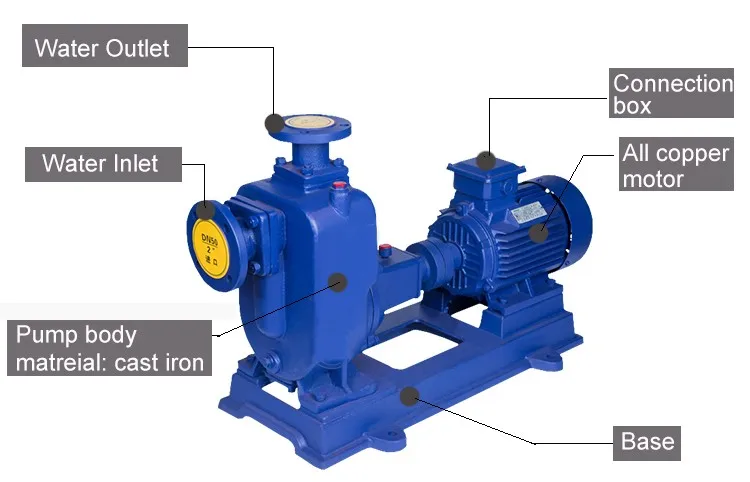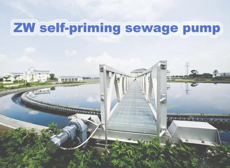 ZW new type non-clog self priming water pump centrifugal sewage pump are special designed for sewage in waste water transfer and treatment, also can be used for farm irrigation. This pump integrates self-suction and non-clogging and uses axial-back flow outside-mixing type and, through the unique design of both pump casing and impeller, dont need to mount a foot valve just like the common self suction pure water pump and also can pump the liquid containing the solid of big grains and long fiber impurities. Compared with the same products, this pump features a simple structure, good self-suction performance, strong sewage draining capacity, high efficiency, energy saving and easy use and repair. The unique structure of open impeller makes sure the free pass of solids in sewage with max size of 60% of outlet DN and fiber 500% of impeller diameter. Suitable for the sewage project in the municipal works, river aquaculture, light industry, paper-making, textile, food, chemical industry, power industry etc, and as the most ideal impurity pump to pump fiber, pulpy, mixed and suspended chemical media.