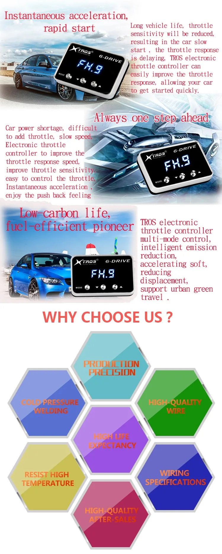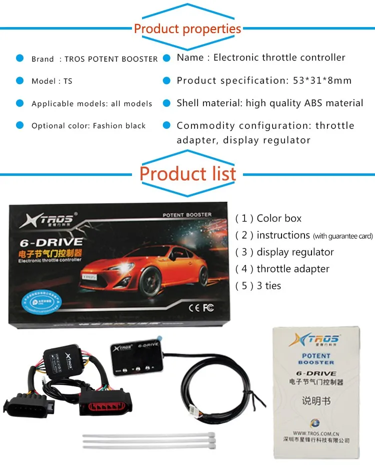 Shenzhen TROS Technology Co., Ltd, founded in 2008, works on develop, produce, sale and related service for Electronic throttle controller, Jump starter etc. TROS has registered the "TROS" and "POTENT BOOSTER" two series of brands. We established a long term business cooperation relationship with international auto aftermarket company, marketing networks covers the whole world .
