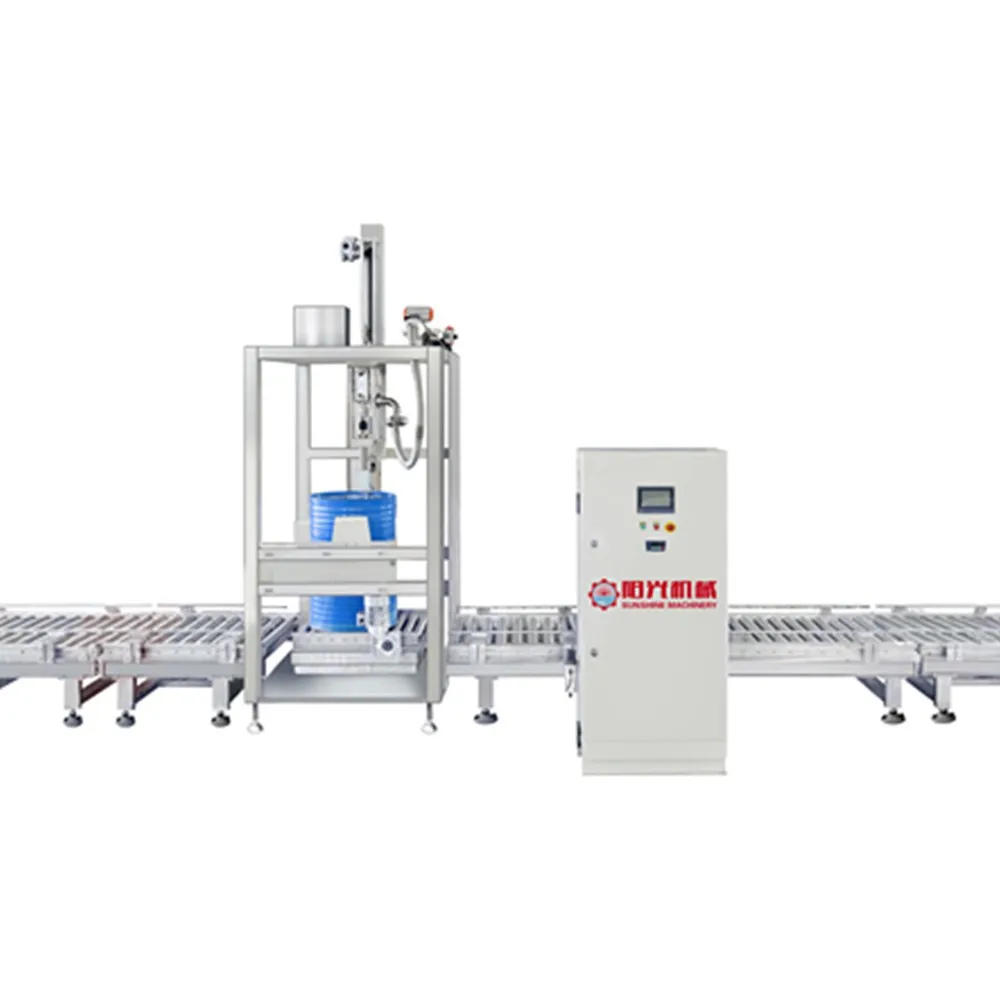 This machine is mainly designed intelligently to 100-300kgs liquid barrel packing system, the filling main parts use stainless steel environmental frame, tempered glass door. When the machine is filling , it is totally enclosed, at the top, it has the air outlet, it can control air emission ;the whole line finish the process during barrel incoming, barrel distinguish, aiming, falling down.And slowly rising according to the filling quantity add, to prevent the bubble .After the filling automatically out of barrel, it is put the caps around the barrel outlet, through the pneumatic capping head screw.After the whole process ending, through the forklift or human handling of materials. This machine uses PLC to control, touch screen operation. I t has characteristics like convenient operation, high efficiency , wide range of application.This machine electric equipment control part is made by PLC, adjust speed channel , it had strong control ability, high automatically . It uses special equipment , so has function of no barrel, no filling, no aiming to barrel outlet, no filling , it avoid of materil waste and pollution, so it made the elector mechanical integration present perfectly .