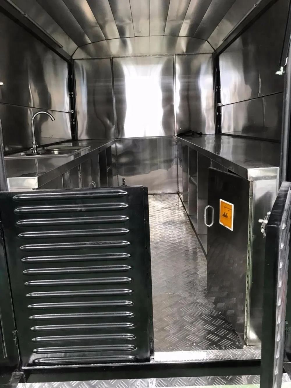 l One service(sales) window in front (sliding window with canopy customized),one door (70cm wide)with lock.Extend stainless workbench by the service window.