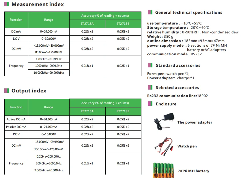 ET2715 Current and Voltage Calibrator is a handheld calibration instrument with high precision, high resolution and high reliability that integrates output and measurement of V, mV, mA and Hz signals. The meter adopts large liquid crystal display with clear reading, and it also has adjustable back light source and automatic shutdown function. The meter can be supplied by dc or ac power supply, which is more convenient to use.