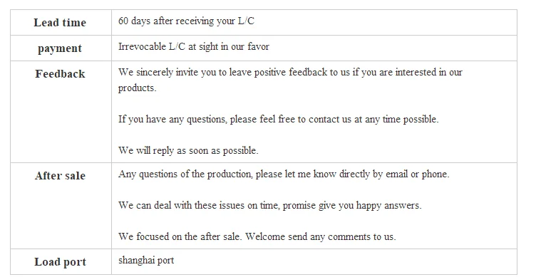 A: In general, our payment is irrevocable L/C at sight or 30%deposit 70% balance before shipment.