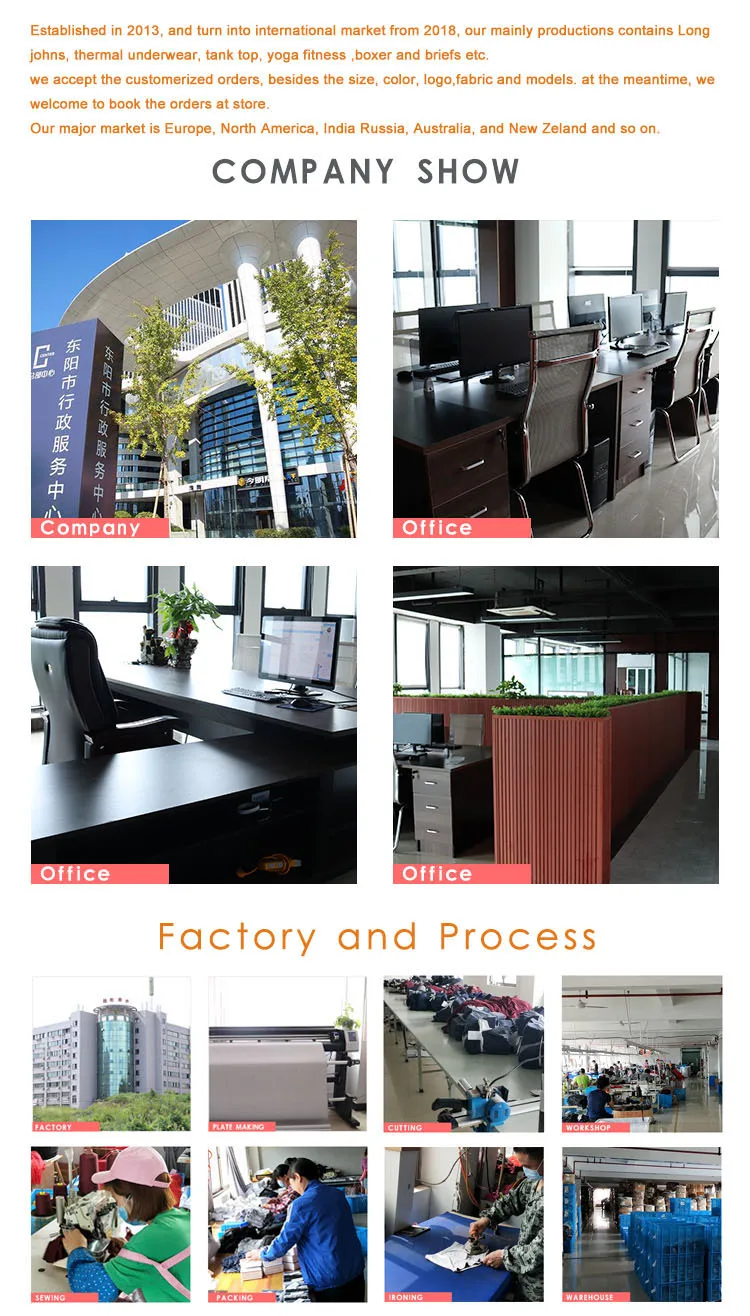 Established in 2013, and turn into international market from 2018, our mainly productions contains Long johns, thermal underwear, tank top, yoga fitness ,boxer and briefs etc.