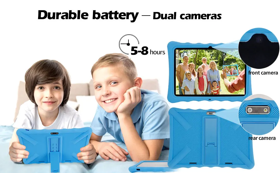 10 inch IPS screen with a resolution of 1280*800, which has a higher definition than before and reduce eye fatigue and protecting eyesight. It can automatically adjust the brightness to a comfortable reading experience. 2G RAM and 32GB storage, which can retain many kids childhood memories.If you feel that these contents still can’t satisfy needs. You can download their favorite apps from google play store. Up to 64GB of expandable storage with micro SD/TF card let you have more space to enjoy the fun. Dual camera with flash, record the happy childhood and some unforgettable moments with friends, and capture fun any time anyplace.