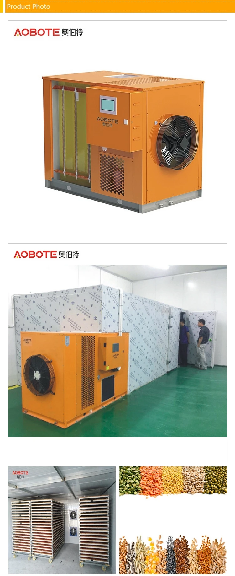 | Type | Dehumidifier | | Application | Medicine Processing, Chemicals Processing, Plastics Processing, Food Processing | | Condition | New | | Place of Origin | Guangdong,China | | Key Selling Points | Easy to Operate | | Warranty | 1 YEAR | | After-sales Service Provided | Online support, Video technical support, Free spare parts, Field installation, commissioning and training, Field maintenance and repair service | | After Warranty Service | Video technical support, Online support, Spare parts, Field maintenance and repair service | | Applicable Industries | Hotels, Garment Shops, Building Material Shops, Manufacturing Plant, Machinery Repair Shops, Food & Beverage Factory, Farms, Restaurant, Home Use, Retail, Food Shop, Printing Shops, Construction works , Energy & Mining, Food & Beverage Shops, Advertising Company | | Local Service Location | None | | Showroom Location | None | | Brand Name | Aobote, OEM, ODM | | Voltage | 380V /3ph / 50Hz | | Power(W) | 2.9 kW input | | Dimension(L*W*H) | 1480 x 980 x 1100 | | Certification | CE, ISO or as request | | Weight | 142 kg | | Name | food drying equipment fruit vegetable dehydration machine | | Output | 9.5 kW | | Capacity | 25 kg/h dehumidifying | | Temperature | 30 - 80℃ | | Advantage | Heat recovery, Electric heater, LCD touch screen, Wifi remote optional | | Used for | Agriculture, industry, medicine and more | | Material | Galvanized steel, SUS304, Aluminum or as request | | Delivery time | 25 DAYS, or as request | | Fresh air volume | 2000m3/h | |