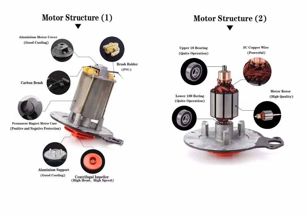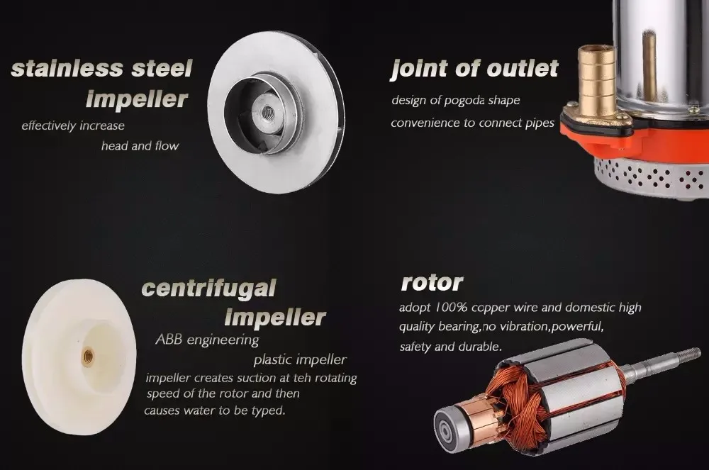 DC small submersible water pump is made of motor and pump, the motor is consists of rotor, bearing and base. The pump body includes impeller, pump body, connections, bearing and mechanical seal.