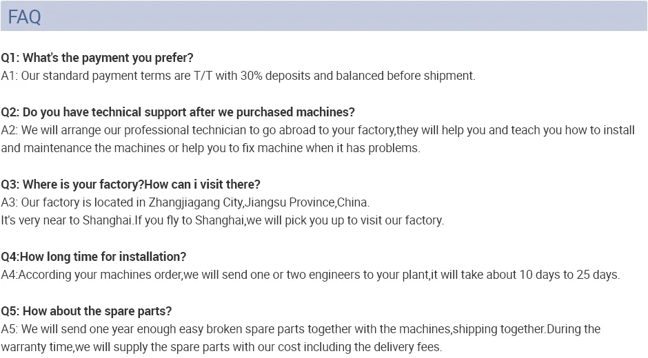 After equipment reached the workshop of customer, place the equipment according to plane layout we offered. We will arrange seasoned technician for equipment installation, debug and test production at the same time make the equipment reach the rated producing capacity of the line. The buyer need to supply the round tickets and accommodation of our engineer, and the salary.